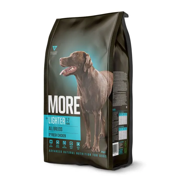 MORE +Lighter Chicken is a complete, natural, and delicious dog food. Developed by vets and pet nutritionists, this hypoallergenic dog food is designed to support weight loss.