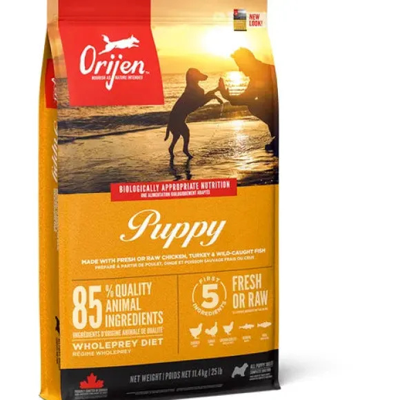 All puppies do best on a Biologically Appropriate diet: one that is rich in protein and fat from quality animal ingredients to support peak development. ORIJEN® Puppy recipe is packed with 85%* quality animal ingredients like fresh or raw+ free-run chicken and turkey**, wild-caught fish, and cage-free eggs. With rich inclusions of Wholeprey animals, ORIJEN dog food is made with the most nutrient-dense, succulent parts of the prey to deliver the nutrition dogs need. The result is a diet for your canine companion that is beyond comparison.