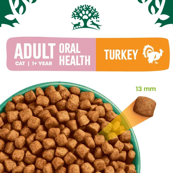 The size and texture of this kibble is designed to try to mimic the effect of brushing. The larger kibble requires your cat bit into each piece, and natural pea fibre alters the texture creating more brush-like action between the kibble and the tooth.