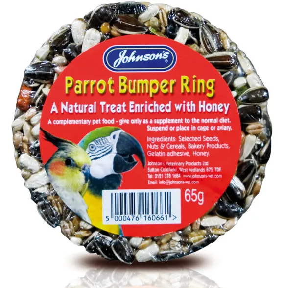 JVP Parrot Bumper Ring is a delicious treat for your parrot which can be given to complement their diet—and it is a guilt free treat! Because it is made with only natural, nutritious ingredients, you won’t find any mysterious chemical names or numbers. As a result it is just packed with tasty nuts, crunchy seeds, cereals, bakery products and sweet honey. A little gelatine is added to help bind the ingredients and form them into a firm ring shape your parrot will love to peck away at! This recipe is specifically designed with parrots in mind. As such your feathered friend will love this fun, tasty, stimulating and nutritious treat. Furthermore you can suspend this JVP Parrot Bumper Ring in your parrot’s home or hang it from their play stand for added interest.