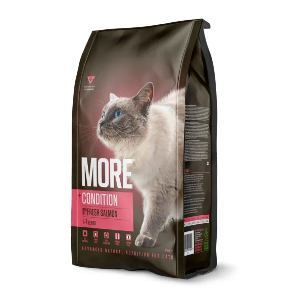 MORE +Condition Salmon complete dry cat food has been scientifically formulated to support skin and coat health.