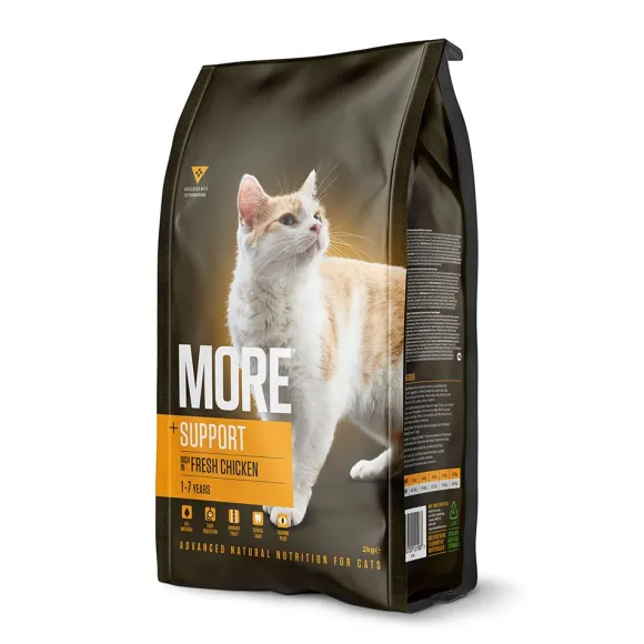 MORE +Chicken complete dry cat food has been scientifically formulated to provide optimal support for adult cats.