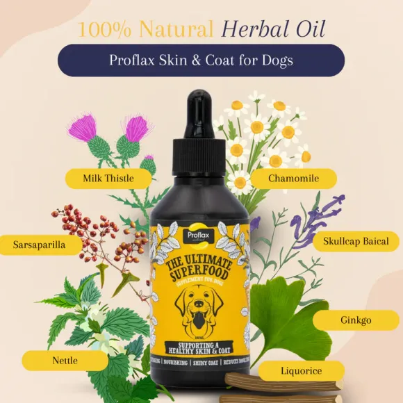 Proflax Skin & Coat is a 100% natural, ready-blended flaxseed oil & herbal tincture supplement. This fabulous product supports all aspects of skin and coat health; fur loss, skin pigmentation loss, moulting, dry, dull or brittle coat, hot spots, dandruff and dry skin. Contains natural steroids and anti-histamine properties to reduce itchiness.